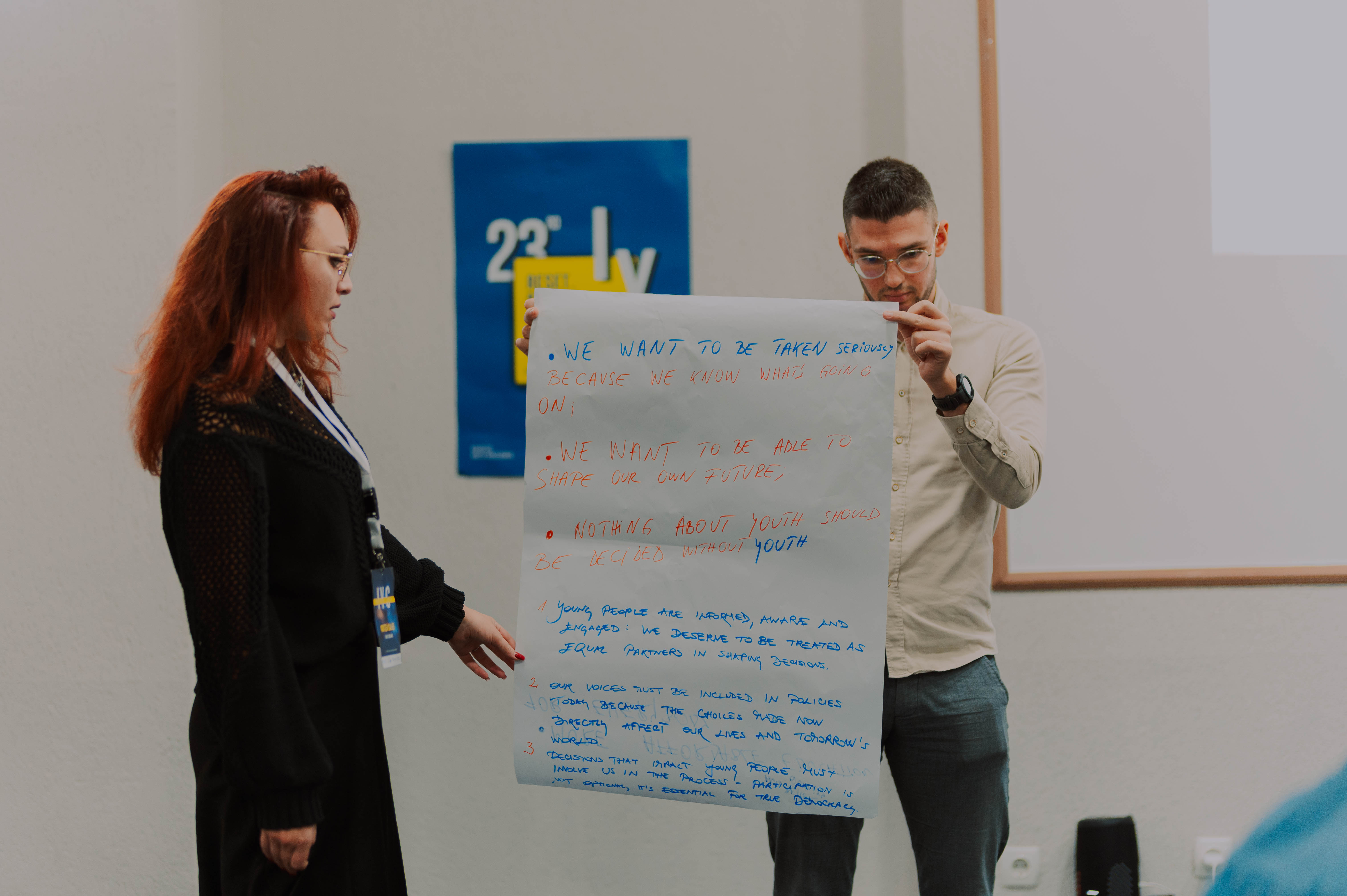 Završni dan bio je posebno inspirativan i produktivan. Tijekom završne radionice mladi iz 14 zemalja zajednički su oblikovali zajedničku poruku donositeljima odluka, u kojoj traže veće uključivanje mladih u procese koji ih izravno pogađaju. Poruka ističe potrebu za redovitim prilikama za javno iznošenje ideja, većom zastupljenošću mladih u odlučivanju te pravom glasa pri raspodjeli proračuna za mlade. Posebno je naglašena važnost uključivanja mladih na izborne liste kako bi kvote za mlade u parlamentima postale demokratski standard, a ne samo ideal. Ova zajednička poruka poslana je na više od 50 adresa relevantnih donositelja odluka širom Europe.